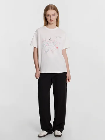 Женская футболка прямого свободного кроя станет идеальным дополнением вашего гардероба. Горловина круглой формы и короткие рукава обеспечивают классический и комфортный образ. Нижний срез модели обработан швом вподгибку, что придает изделию аккуратный вид. Изделие выполнено из кулирки — материала, отличающегося отличной воздухопроницаемостью и мягкостью, что делает его идеальным для повседневной носки. Кулирка отлично сохраняет форму, не растягивается и не теряет цвет после стирки при правильном уходе.