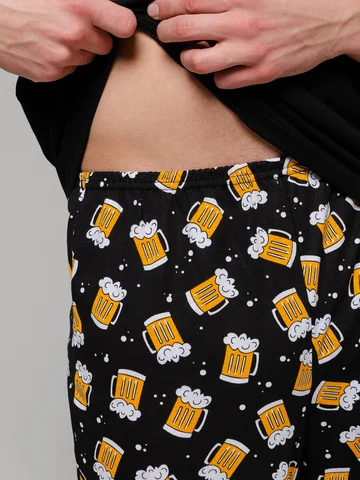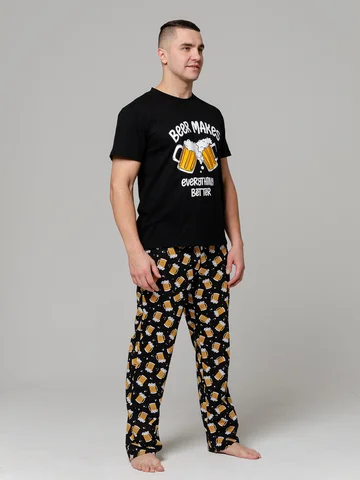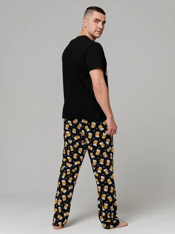 Мужская хлопковая пижама , состоит из футболки с округлой горловиной и классическими брюками прямого силуэта, пояс на резинке. Без карманов. Может быть использован как и домашний костюм. Рисунок на брюках может смещаться. Длина по спинке 69-73 см, длина брюк 105-109 см. Состав 100% хлопок. Рекомендации по уходу : бережная стирка при 30 градусах