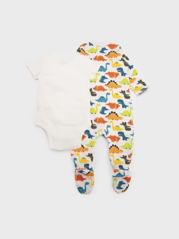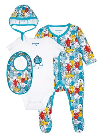 Комплект для новорожденного: комбинезон, боди, чепчик, нагрудник. Комбинезон с застежкой на кнопки. На пятке легкая фиксация на тонкую резинку. Боди имеет застежку на кнопки. Чепчик из трикотажа с завязками. Нагрудник из трикотажа с застежкой на липучку.