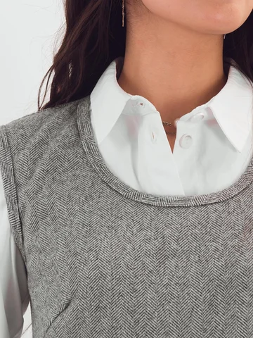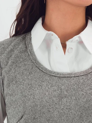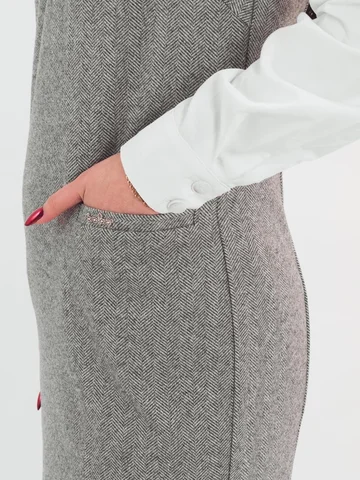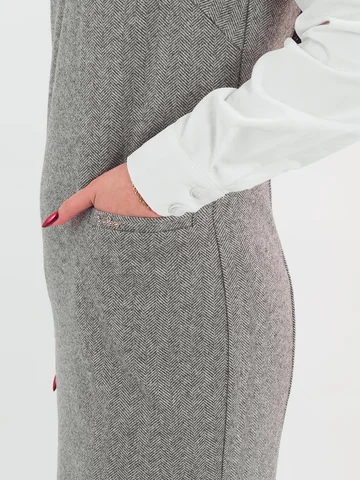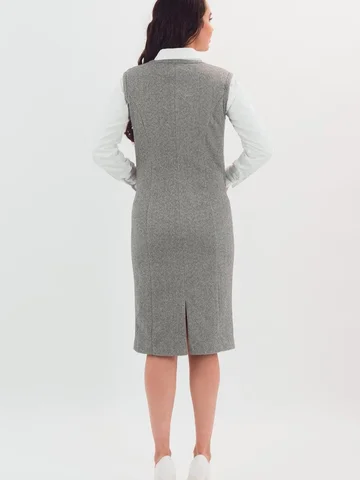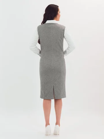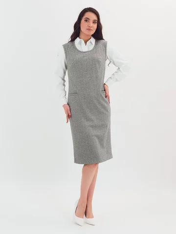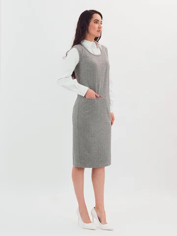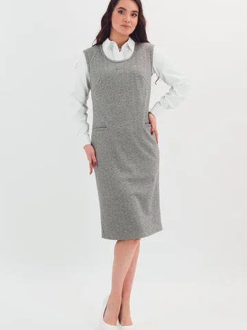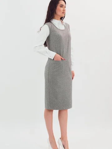 Трикотажный сарафан имеет комфортную посадку за счет вытачек и небольшие функциональные карманы. Такая модель сарафана стильно смотрится с классическими блузами, водолазками и рубашками.