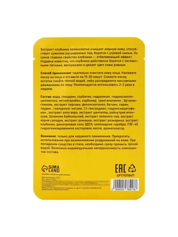 Маска тканевая увлажняющая для лица с экстрактом клубники SB BEAUTY