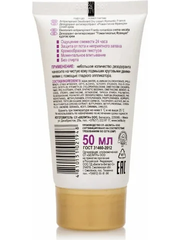 Lovely moments Дезодорант-антиперспирант сухой крем Романтическая Франция 50 мл. Белита. ощущение свежести на 24 часа защита от пота и неприятного запаха моментальное впитывание нежный парфюмированный аромат без содержания спирта аромат создан по мотивам Hypnose Lancome