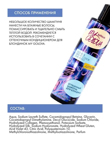 "My Golova" Шампунь оттеночный для блондинок 250мл (Selfielab). Hello! Its me твой идеальный блонд. Шампунь BLOND&BRIGHT COLOUR усилен фиолетовыми пигментами, которые заставят сиять твой блонд с новой силой! Ухаживающие протеины шелка заметно улучшат состояние волос, защитят их от негативных факторов и УФ-лучей. Гидролизат коллагена и протеины пшеницы сделают волосы мягкими и эластичными. Благодаря гиалуроновой кислоте они станут плотными и увлажненными. Нанесите на чистые влажные волосы, для равномерного распределения прочесать волосы гребнем. Время выдержки 3-10 минут в зависимости от желаемой степени коррекции цвета. По истечении времени воздействия смыть теплой водой.