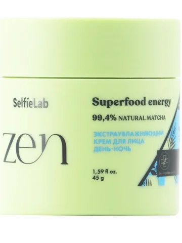 "Zen" Экстраувлажняющий крем для лица день-ночь 45г (Selfielab). Подарите своей коже заряд энергии, молодости вместе с ZEN SUPERFOOD. Ощутите покой, умиротворение, гармонию с окружающим миром. Экстраувлажняющий крем для лица ZEN SUPERFOOD ENERGY для нормальной и сухой кожи обеспечивает полноценный уход и интенсивное питание, устраняет сухость и шелушение. Суперфуд матча - уникальный «усилитель красоты» и источник здоровой энергии. Крем обладает сильным антиоксидантным действием, выравнивает рельеф, снимает воспаления и улучшает цвет лица. Масла ши и жожоба, а также экстракт липы способствуют обновлению кожи, обогащают витаминами, защищают от основных факторов старения. Тающая текстура крема обеспечивает коже «эффект выходного дня». Применение: Нанесите средство на ладони, деликатно потрите их друг о друга, чтобы теплом активировать целебную силу суперфуда матчи. Поднесите ладони к лицу, нежно нанесите крем на лицо, дайте впитаться. Состав: Аqua, Cetearyl Alcohol, Glycerin, Jojoba butter, Glyceryl Stearate, Isopropyl palmitate, PEG-40 Hydrogenated Castor Oil, Camellia Siensis Leaf Extract, Butyrospermum parkii (shea butter), Tilia cordata Extract, Vitis Vinifera Frut Extract, Propylene Glycol, Sorbitol, Ceteareth-20, Ceteareth-12, Cetyl Palmitate, Sodium Polyacrylate, Dehydroacetic acid, Benzoic acid, Benzyl alcohol, Phenoxyethanol, Sodium benzoate, Citric Acid, EDTA, Trilon B, Parfum.