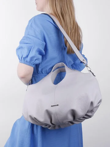 Сумка большая. Кожа пористая, свинная. Ремешок на плечо коротковат для меня. Но сумкой довольна. Очень стильная.