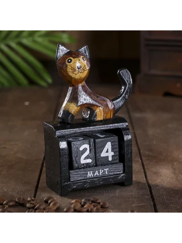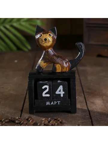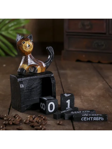 Вечный календарь настольный «Котик», 4×7×12 см, дерево.