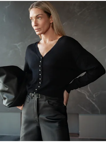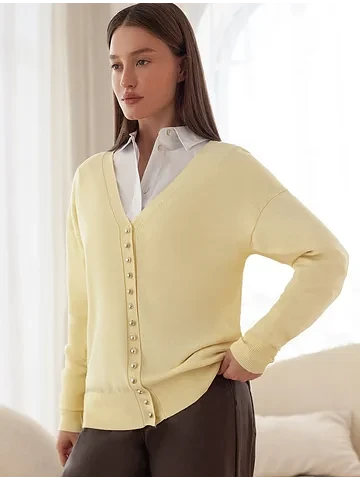 Кардиган тонкой вязки выполнен из нежной пряжи вискозы с нейлоном. Лаконичный силуэт дополнен яркой фишкой изделия - ряд золотистых пуговиц, визуально вытягивающий силуэт. Очень приятное к телу изделие, в котором будет не жарко даже в самые теплые дни. Изделие дополнено логотипом бренда.