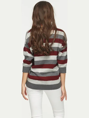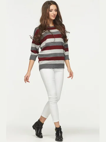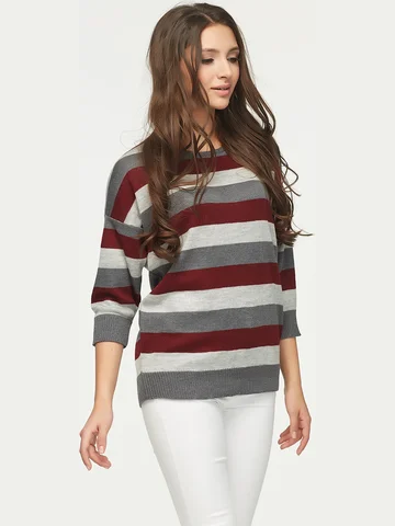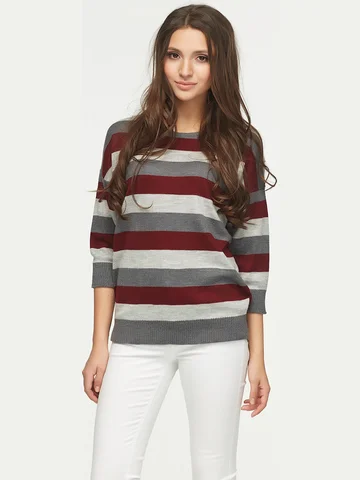 Вязаный джемпер в крупную полоску со спущенной проймой рукава длиной 3/4. Вырез горловины овальный и оформлен бейкой. Длина изделия по спинке около 67 см (44 р), около 68 см (50 р).