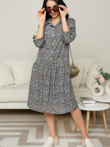 Повседневное свободного силуэта платье с рубашечной застежкой до пояса и отложным воротничком без стойки выглядит элегантно и романтично. Рукав длиной три четверти декорированы патами с пуговицами, что делает их форму интереснее. Умеренно расклешенная юбка средней длины удобна в повседневной жизни.