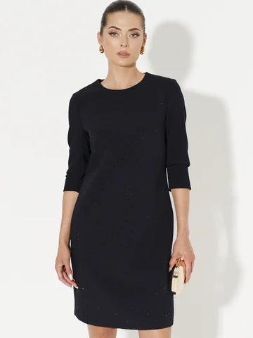 Платье женское из смесовой ткани для повседневной носки полуприлегающего силуэта. Перед имеет две нагрудные вытачки. Перед украшен мерцающими стразами. Спинка со средним швом и потайной зестежкой-молнией в шве. Рукава чуть ниже локтя и небольшими разрезами по локтевому шву. Очень изысканное платье на все случаи жизни, комфортное в носке и с безупречной посадкой по телу.