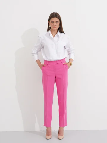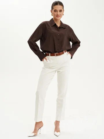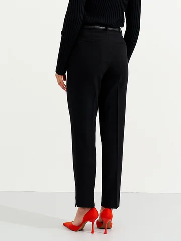 Брюки женские прямые из смесовой ткани на подкладке для повседневной носки. Верхний срез брюк обработан притачным поясом, застежка на один крючок, а также имеется застежка на тесьму-молнию в среднем шве брюк. Задняя часть брюк имеет талиевые вытачки и прорезной карман в рамку с двумя обтачками. В брюках расположен в боковом шве карман с подкройным бочком. Отличный классический вариант брюк, которые будут гармонично смотреться под любые изделия.