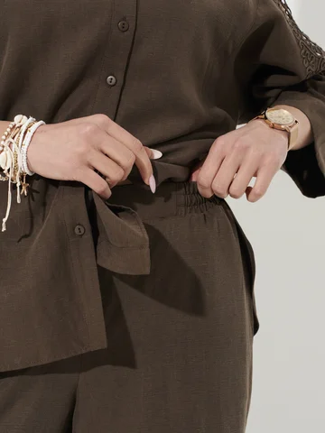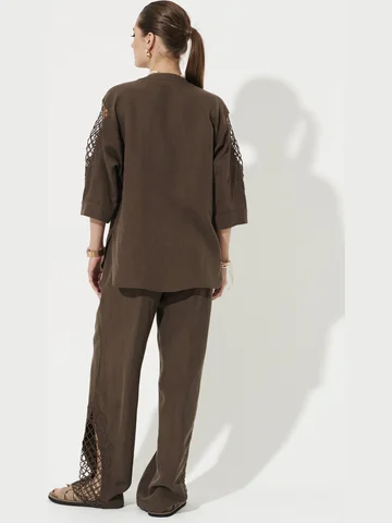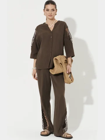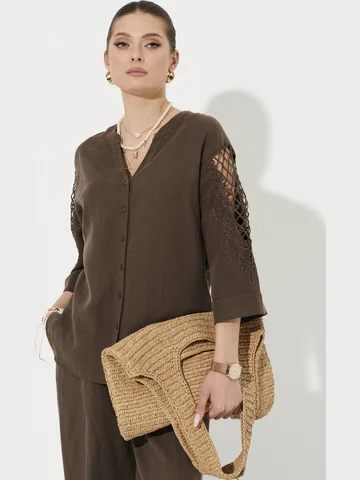 Блузка женская из смесовой ткани с добавлением льна для повседневной носки. Блузка прямого силуэта. Застежка центральная бортовая на обметанные петли и пуговицы. Перед по низу короче, чем спинка и слегка скруглен. В боковом шве имеются небольшие разрезы по низу изделия. Горловина V-образная обработана отрезной стойкой и планкой. Линия плеча чуть спущена. Рукава втачные, длиной ниже локтя, на рукавах имеется дизайнерская вышивка в виде шнура. Низ рукава обработан притачной манжетой. Данная модель блузки в коричневом оттенеке будет отлично сидеть на любой фигуре, а также стильный фасон не оставит никого равнодушным. В данной блузке вы всегда будете в центре внимания.