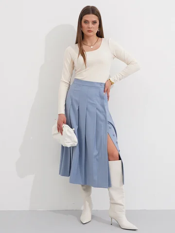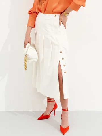 Юбка А-силуэта с оригинальным кроем от бренда Ketty станет идеальным решением для любительниц женственности и делового стиля. Юбка женская миди с поясом фиксируется сбоку на одну пуговицу в тон. Сбоку сделан акцент в виде разреза и застежек-пуговиц. Юбка женская превосходно сидит по фигуре и корректирует область талии. Юбка декорирована плиссировкой с широкими складками и создает дополнительный объем и легкость. Длинная юбка с разрезом имеет подкладку для комфортной носки. Юбка миди предполагает многообразие вариантов для комбинирования: с джемпером, базовой рубашкой, водолазкой, футболкой. Идеально подойдет для прогулок, работы, отдыха, свиданий, офиса, праздников и для повседневной носки. В женской юбке вы будете чувствовать себя уверенно и комфортно!