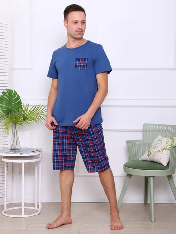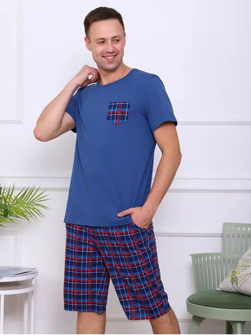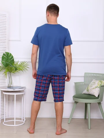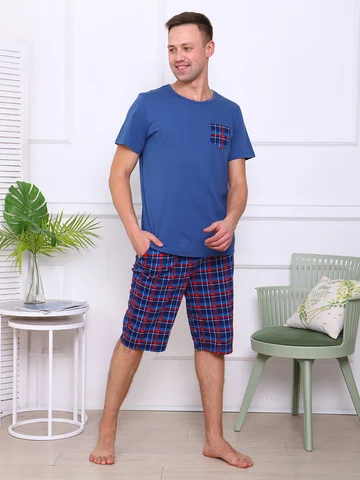 Комплект мужской из набивных шорт и гладкой футболки. Шорты с карманами на поясе, футболка с коротким рукавом, на детали переда накладной карман.Состав:100% хлопок.Ткань:кулирка. Ширина изделия по линии груди: 48-62 см., длина изделия по спинке: 70-73 см, длина изделия по боковому шву: 60-61 см.