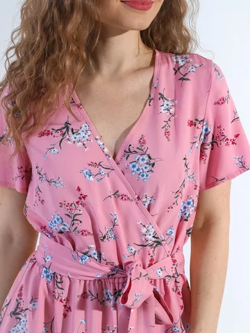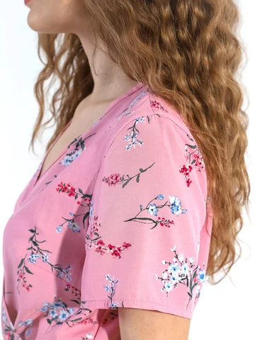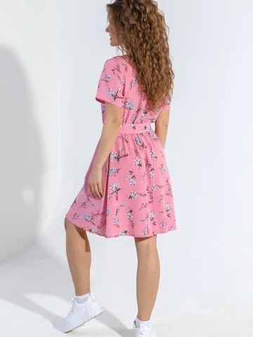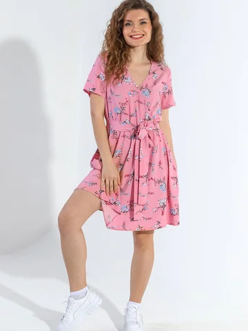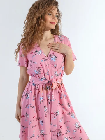 Платье молодежное из тканого штапельного полотна с набивным цветочным рисунком, отрезное по талии, с расклешенной юбкой, собранной по талии с помощью эластичной тесьмы и короткими втачными рукавами. Полочки лифа образуют запах и V-образную конфигурацию выреза горловины. Бортовые срезы и горловина окантованы основным материалом.