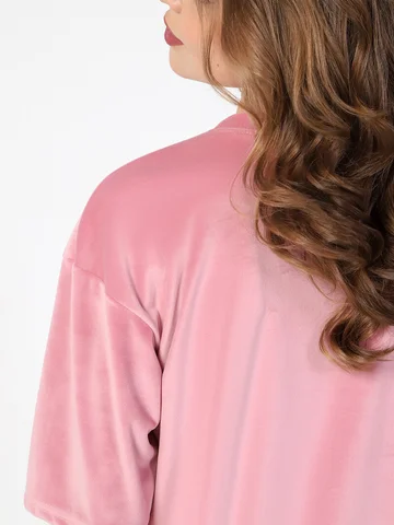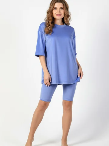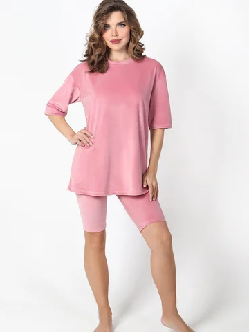 Костюм из гладкокрашеного трикотажного полотна «велюр стрейч», состоящий из футболки и леггинсов. Футболка – удлиненная, свободного покроя, со спущенной, линией плеча, короткими втачными рукавами, горловиной овальной формы, обработанной втачной планкой.Леггинсы – длиной до колен, с эластичной тесьмой по талии.