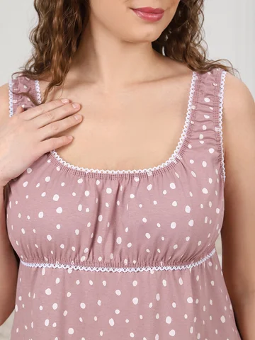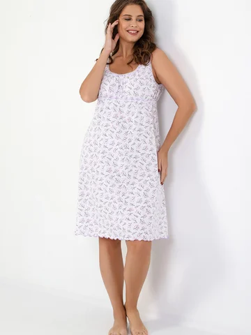 Сорочка женская из трикотажного полотна «кулирка» с набивным рисунком, расширенная книзу, без рукавов, с расширенной, углубленной горловиной овальной формы и притачной кокеткой по переду. Срезы пройм и горловины, а также шов притачивания кокетки, обработаны фасонной эластичной тесьмой с кружевным краем. Низ изделия обработан узкой обметочной строчкой.