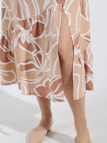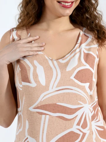 Сарафан женский из тканого штапельного полотна с набивным рисунком, удлиненное свободного силуэта, без рукавов, с рельефными швами, выходящими из пройм. По нижнему косому срезу притачная оборка и разрез в левом рельефном шве. Проймы и V-образная горловина окантованы основным материалом.