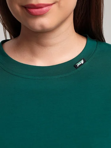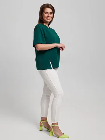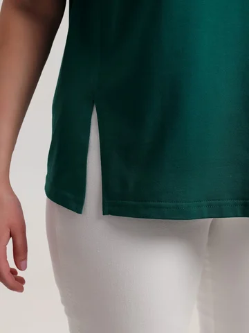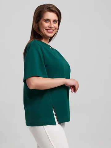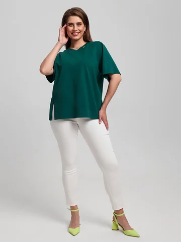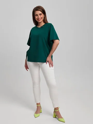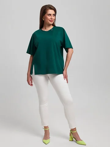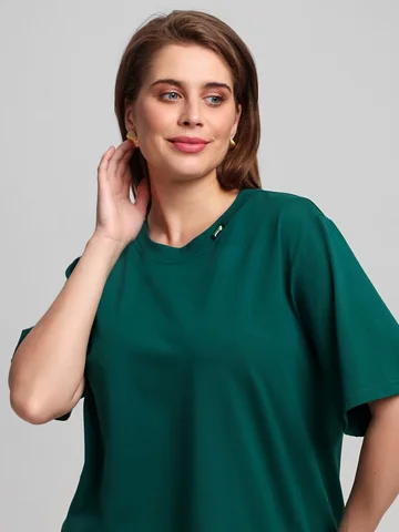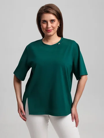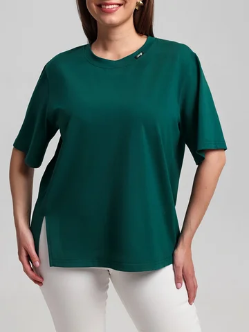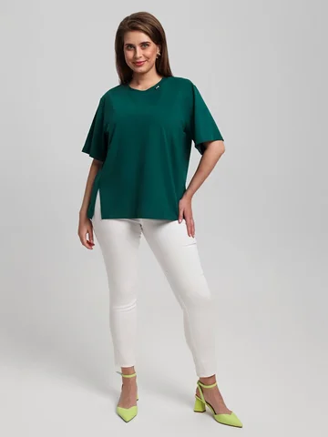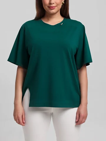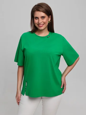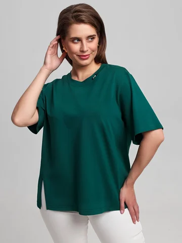 Футболка женская из гладкокрашенного трикотажного полотна «кулирка», свободного силуэта, с боковыми швами, переходящими в рельефы, в правом соединительном шве выполнен разрез. Горловина овальной формы обработана втачной планкой и дополнена декоративным элементом.