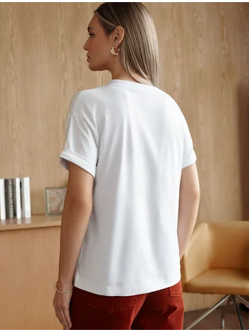 Футболочка супер! Качество отличное.Очень симпатично смотрятся рукава с отворотами.