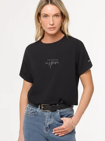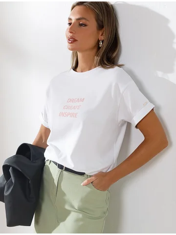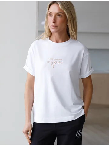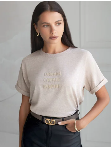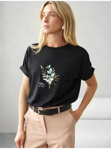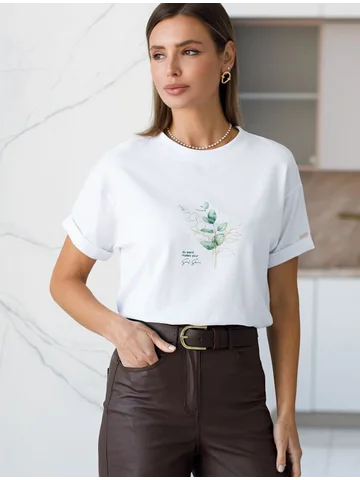 Футболка из премиального хлопка, высокое качество хлопковых волокон обеспечивает комфорт в любое время года. Горловина выполнена из рибаны в тон изделия, Рукава с подворотами и золотистым логотипом бренда. Авторский принт нанесен фактурными красками с устойчивым покрытием. За счет эластана в составе идеально держит форму и сохраняет внешний вид в течение долговременного использования. Универсальная вещь для ваших стилистических решений.
