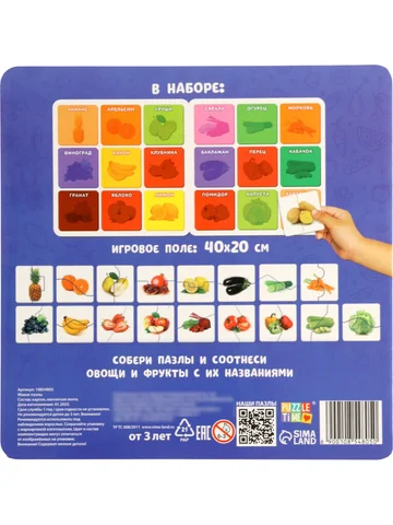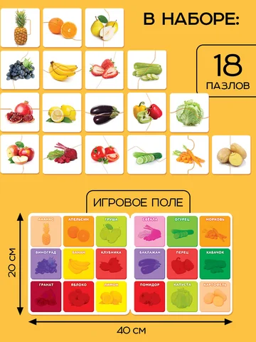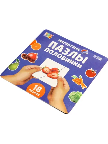 Магнитные макси - пазлы половинки «Фрукты и овощи», 18 пазлов, 36 деталей. Магнитные пазлы «Фрукты и овощи» — это настольная головоломка для детей от 3 лет. В наборе — 18 парных пазлов (всего 36 деталей), выполненных из картона с магнитной лентой. Игра комплектуется игровым полем с магнитной поверхностью, что делает сборку удобной и увлекательной. Тематика еды помогает ребенку узнавать новые продукты в игровой форме. Что внутри