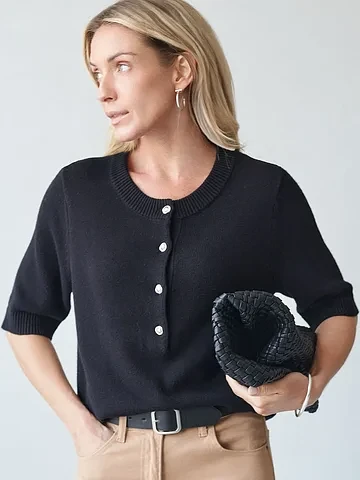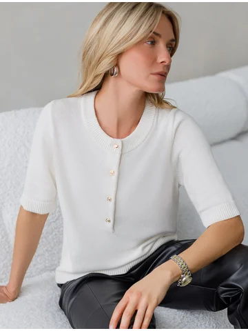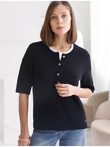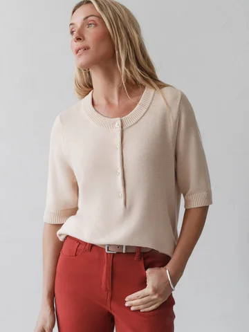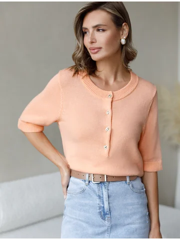 Джемпер тонкой вязки выполнен из хлопка с добавлением кашемира. Модель с круглым вырезом дополнена золотистыми пуговицами. Мягкая и очень приятная пряжа совершенно не колется, сохраняет тепло при этом не перегревая, гарантируя безупречный комфорт.