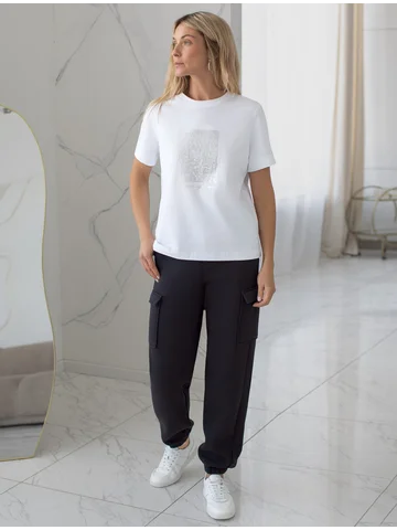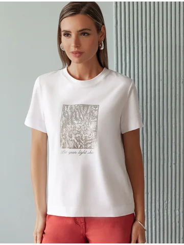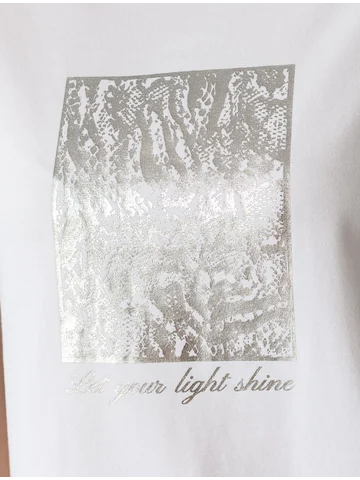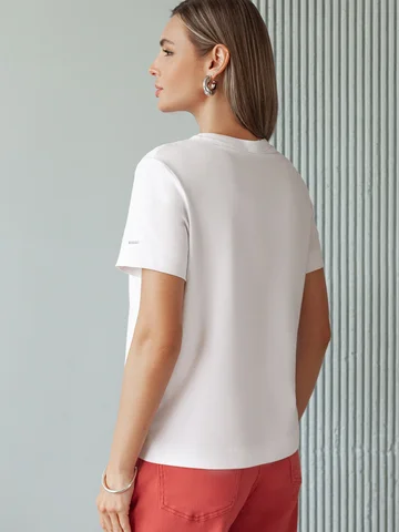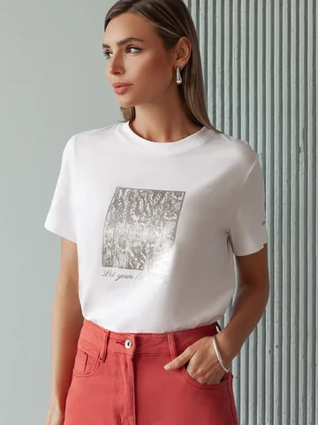 Футболка выполнена из премиального хлопка с эластаном. Эффектный фактурный принт нанесен фольгой с устойчивым покрытием, он станет дополнением не только в повседневных сочетаниях, но и отлично подойдет к вечерним образам.Изделие отлично держит форму, почти не мнется и комфортно сидит по фигуре. Отдельным украшением служит металлический логотип бренда на рукаве изделия.