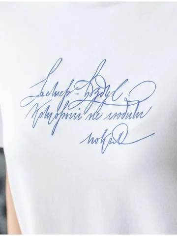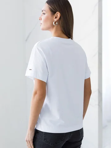Футболка выполнена из премиального хлопка. Авторский принт нанесен фактурными красками с устойчивым покрытием. Наличие эластана в составе гарантирует комфорт и формоустойчивость. Изделие дополнено фирменным металлическим логотипом бренда.