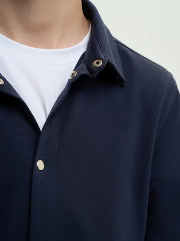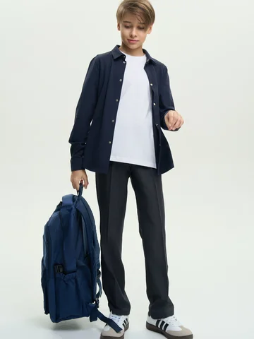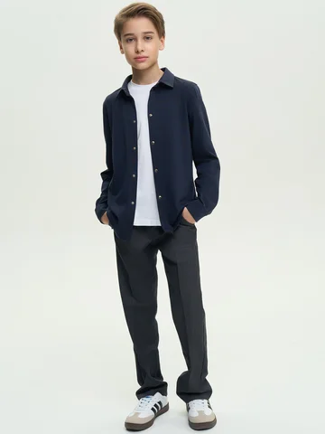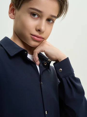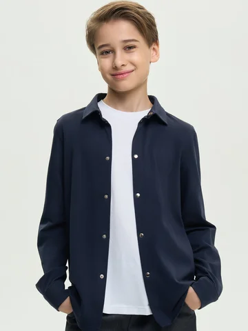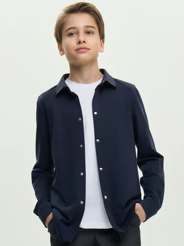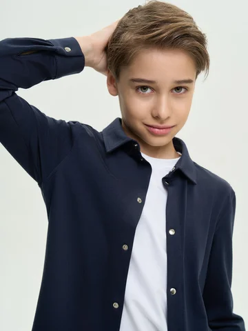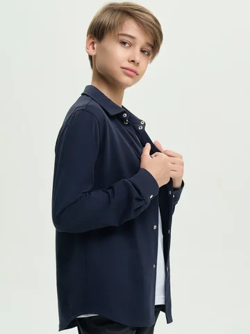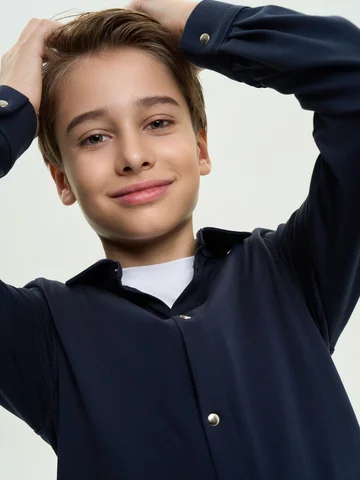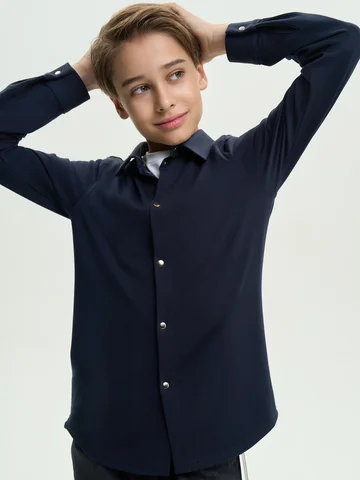 Классическая темно-синяя сорочка на кнопках подойдет в школу, на праздник и на выпускной. Модель полуприлегающего силуэта с длинным рукавом из хлопчатобумажного полотна кулирки с добавлением эластана.