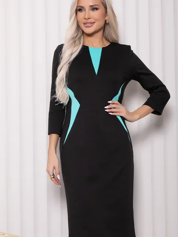 Платье полуприлегающего силуэта из плотного трикотажа с контрастными вставками. Вставки придают фигуре изящные женственные очертания, а вертикальная вставка на горловине визуально создаст вытянутый стройный силуэт. Рукава втачные длиной ¾. В среднем шве спинки застежка на потайную молнию и шлица.
