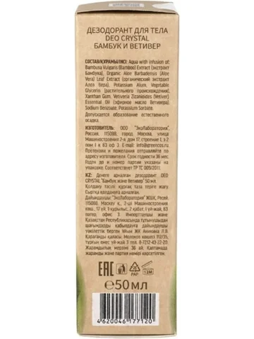 Дезодорант для тела DEO CRYSTAL "Бамбук и ветивер" 50мл EO laboratorie. Дезодорант EO Laboratorie – это естественное гипоаллергенное средство по уходу за кожей. Безопасен для любого типа кожи, бережно ухаживает за раздраженной кожей даже после эпиляции. Активные ингредиенты: Алюмо-калиевые квасцы адсорбируют лишнюю влагу, а дезинфицирующие свойства избавляют от причины неприятного запаха, снижающие секрецию потовых и сальных желез. Экстракт алоэ вера успокаивает кожу, делает ее нежной, мягкой и ухоженной. Экстракт бамбука смягчает, оставляет ощущение комфорта и ухоженности Масло ветивера оказывает успокаивающее и охлаждающее действие, снимает дискомфорт, вызванный воспалительными процессами. Состав Aqua, Potassium Alum, Glycerin (растительного происхождения), Quercus Robur Bark Extract (экстракт коры дуба), Camellia Sinensis Leaf Extract (экстракт зеленого чая), Xanthan Gum, Melaleuca Alternifolia Leaf Oil (эфирное масло чайного дерева), Lavandula Angustifolia Oil, Citrus Aurantum Dulcis Oil, Cupressus Sempervirens Leaf Oil, Caprylyl/Capryl Glucoside, Benzyl Alcohol, Ethylhexylglycerin.