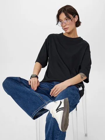 Футболка женская свободного силуэта из трикотажного интерлока — это удобная и универсальная модель, которая подходит для самых разных случаев: от расслабленных выходных до повседневных дел. Мягкий, гладкий материал интерлок дарит приятные ощущения на коже, не раздражает и хорошо дышит, сохраняя форму даже после частых стирок. Круглая горловина оформлена эластичной обтачкой из рибаны — она не растягивается и сохраняет аккуратный вид со временем. Спущенное плечо и углубленная пройма придают модели современный силуэт с ноткой расслабленного стиля, а рукава длиной до локтя делают футболку особенно комфортной, добавляя визуального баланса. Широкие подгибки по низу и рукавам подчеркивают качественную обработку изделия и создают завершенный образ. Такую футболку легко сочетать с джинсами, шортами, легинсами или спортивными брюками — она становится базовой частью гардероба, которая работает в любом стиле.
