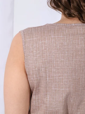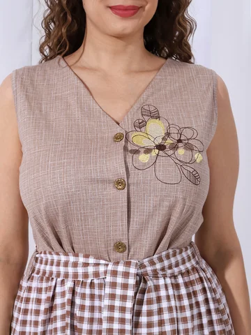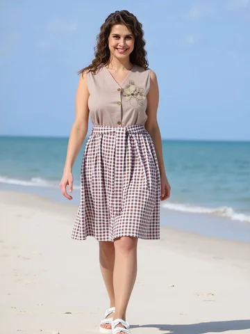 Сарафан из трикотажного полотна «кулирка» в сочетании двух видов в единой цветовой гамме: с мелкоузорчатым набивным рисунком, имитирующим ткацкое переплетение «рогожка» и с рисунком в мелкую клетку, отрезной по линии талии, с V-образной горловиной, центральной бортовой застежкой на обметанные петли и пуговицы и вышивкой на левой полочке лифа. Горловина спинки и проймы окантованы основным материалом. Юбка присборена по шву соединения с лифом. Съемный завязывающийся пояс фиксируется двумя шлевками из окантовки, вставленными в боковые швы на уровне талии.