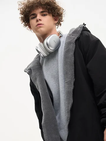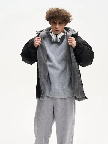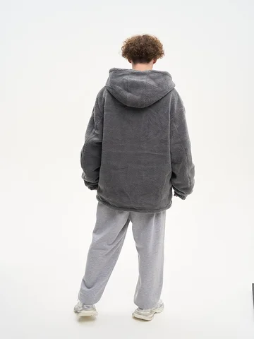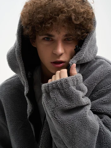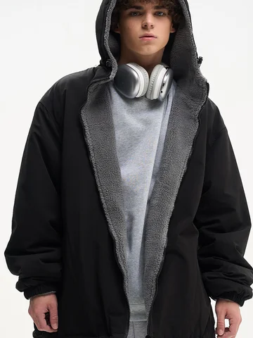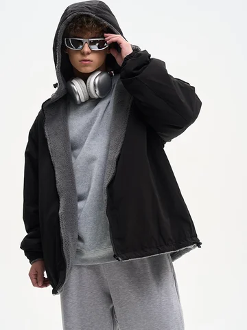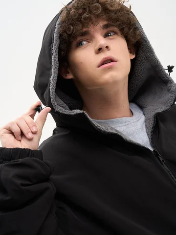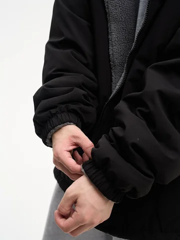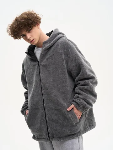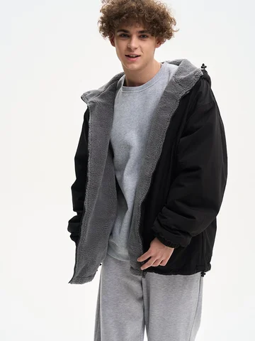 ДВУХСТОРОННИЙ НАЧЕС. Куртка оверсайз. Унисекс. На одной стороне - водоотталкивающая курточная ткань. Другая сторона из исскуственного меха "шерпа". Карманы по обеим сторонам. Тракторная молния. В капюшоне и по низу продета шляпная резинка со стопперами.