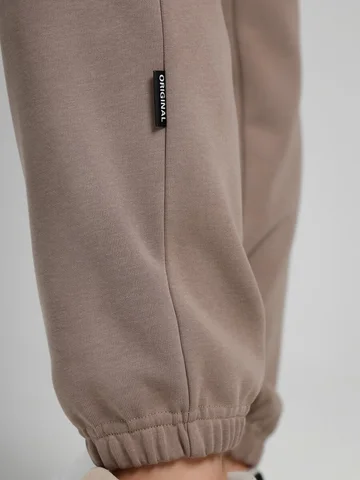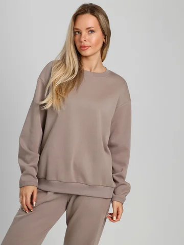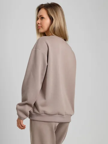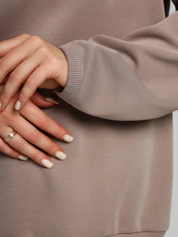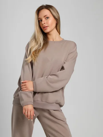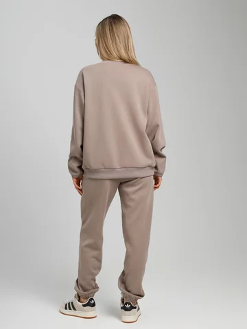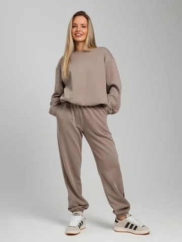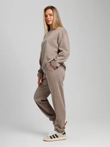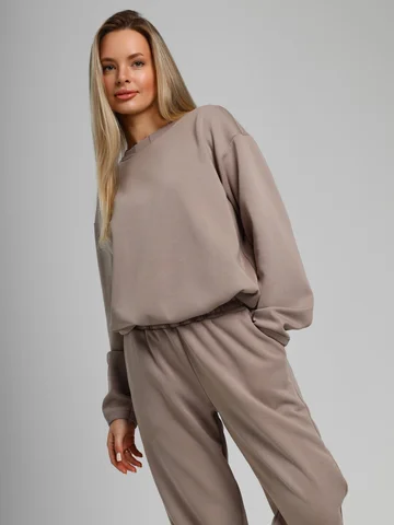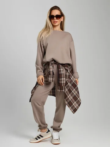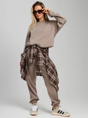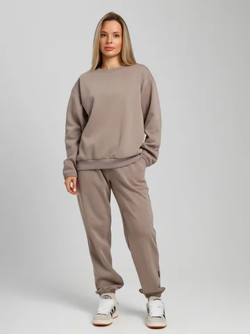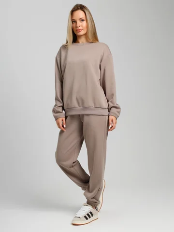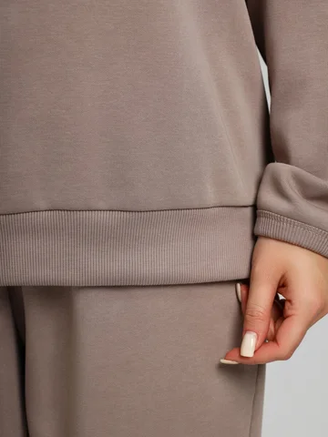 Костюм молодежный из гладкокрашенного трикотажного полотна «лининг», состоящий из джемпера и брюк. Джемпер – свободного покроя, с длинными втачными рукавами, горловиной овальной формы, обработанной втачной планкой, состоящей из двух частей. Окантованные нижние срезы рукавов, планка горловины и пояс из полотна «кашкорсе» такого же цвета, как и основной материал. Притачной пояс выполнен с вложением эластичной тесьмы, регулируемой по длине фиксаторами.Брюки – длинные, с карманами в боковых швах, на притачном поясе с эластичной тесьмой внутри, в левом боковом шве вставлен декоративный элемент. Нижние срезы обработаны подгибкой с вложением эластичной тесьмы.