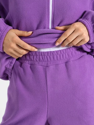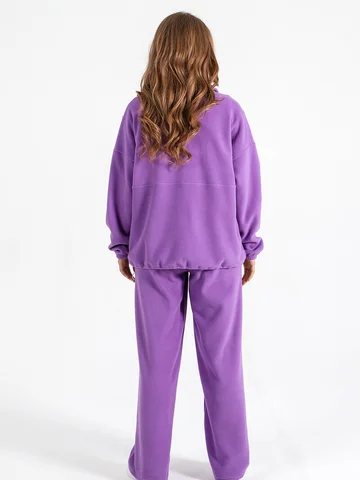 Костюм, состоящий из толстовки и брюк. Толстовка - свободного покроя, средней длины, с длинными рукавами на основе цельнокроеных. Деталь переда - с отрезной кокеткой, состоящей из четырех деталей, симметрично расположенных относительно центрального шва, обработанного с застежкой на тесьму "молния". Спинка - с отрезной кокеткой. Нижние срезы рукавов обработанышвом вподгибку с эластичной тесьмой. Низ изделия обработан швом вподгибку. По всем основным соединительным швам толстовки настрочены отделочные строчки. Брюки - длинные, свободного покроя, на притачном поясе с эластичной тесьмой внутри и карманами в боковых швах. Нижние срезы обработаны швом вподгибку с эластичной тесьмой. По низу джемпера и низу брюк - эластичная тесьма с фиксаторами для регулировки ширины изделий на этих участках.