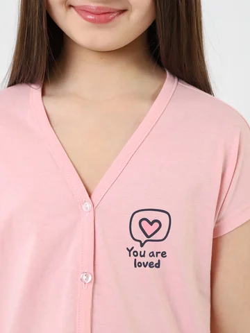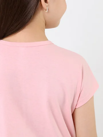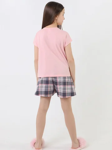 Пижама для девочки, состотящая из блузы и шорт. Блуза пижамная - из гладкокрашенного полотна "кулирка", свободжного покроя, с короткими цельнокроеными рукавами, V-образной горловиной и центральной бортовой застежкой на обметанные петли и пуговицы. В верпхней части левой полочки - принт, выполненный в технике шнлкографии. Борта и горловина окантованы основным материалом. Шорты - из полотна "кулирка" в клетку, расклешеные, короткие, с эластичной тесьмой по талии.