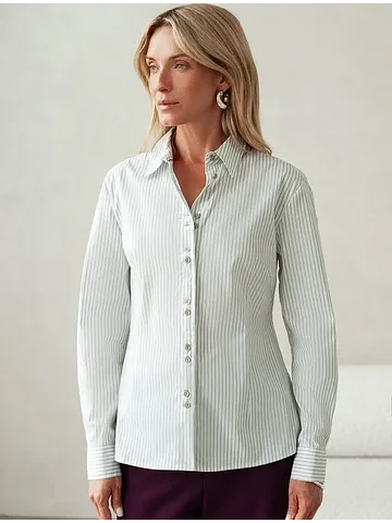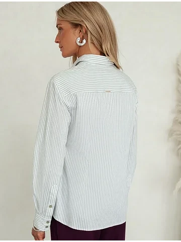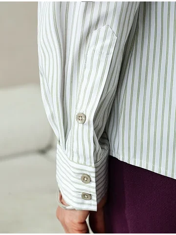 Блузка прилегающего силуэта выполнена из формоустойчивого хлопка. Фишкой изделия служат парные контрастные пуговицы. На спинке фирменный металлический логотип бренда. Изделие хорошо держит форму, подчеркивает силуэт и подходит для любой фигуры. Идеальный вариант для респектабельных образов в деловом стиле.