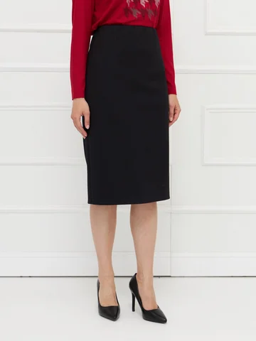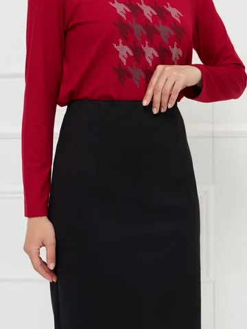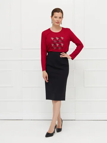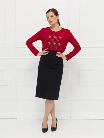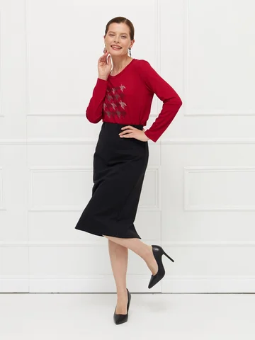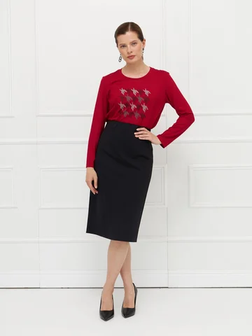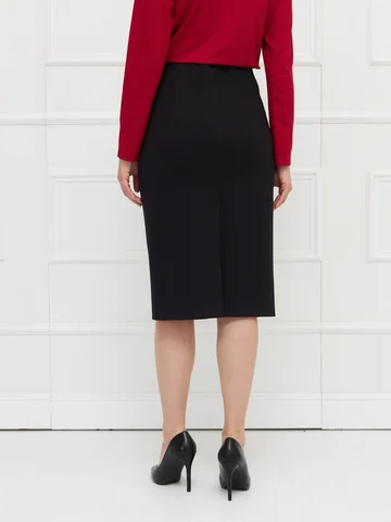 Юбка выполнена из плотного черного джерси — материала, который комфортен и хорошо держит форму. Модель без подкладки, без застежки, с широкой скрытой резинкой на верхнем срезе для удобной и точной посадки по фигуре. Зауженный силуэт подчеркивает стройность фигуры, а длина до середины колена делает юбку универсальной для разных образов. Сзади предусмотрена шлица для свободы движений и комфорта в носке. На фото в паре Джемпер С-63 ШИП(О5).