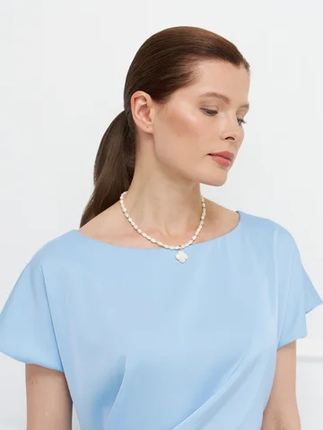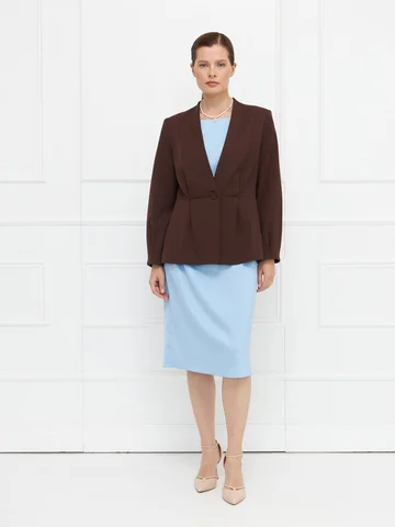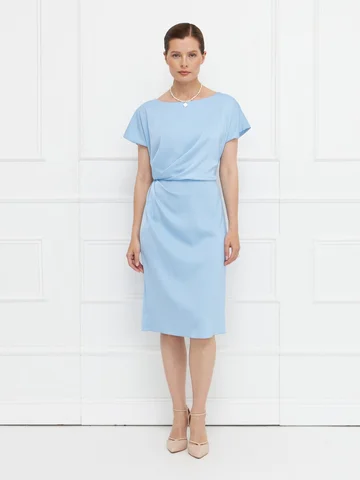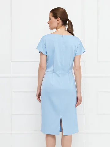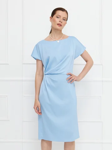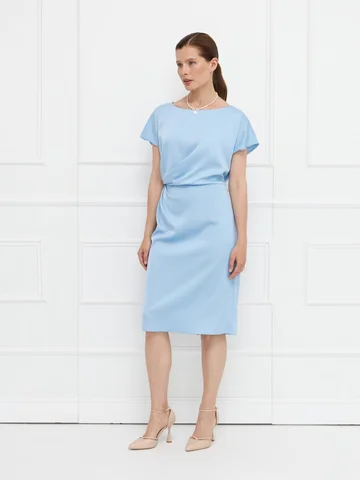 Платье прямого кроя выполнено из голубого атласа с деликатным блеском. Короткие цельнокроеные рукава обеспечивают комфортную посадку. Ассиметричные драпировки по переду мягко моделируют силуэт, скрывая возможные несовершенства. Застежка — потайная молния сзади, дополнена аккуратным разрезом для свободы движения. Модель на подкладке, что повышает комфорт и сохраняет форму. Элегантный вариант для особых случаев и деловых встреч. На фото в паре Жакет В-969 ГОШ(О5).