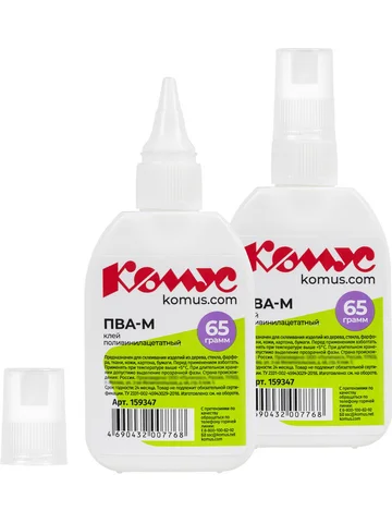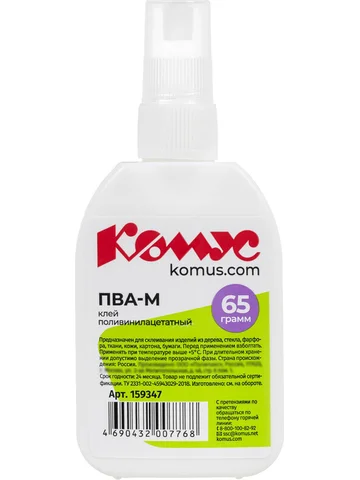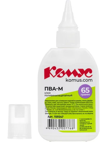 Клей ПВА Комус предназначен для склеивания бумаги и картона, дерева, ткани, керамики, кожи и т.д. Отлично подходит для хобби и творчества для взрослых и детей. Пластиковый дозатор обеспечивает точное нанесение и экономный расход. Имеется съемный колпачок, который предохраняет клей от засыхания. Объем клея 65 г (60 мл). Клей ПВА при минусовых температурах замерзает, т.к. сделан на основе воды, но при оттаивании не теряет своих свойств. Его можно заморозить и размораживать 5 раз при температуре до −25 С, и он не потеряет ни своих свойств, ни товарного вида. Температура воздуха при использовании не ниже +5. Необходимо взболтать перед применением. Способ применения: Перед применением клей следует тщательно взболтать. Далее равномерно нанести клей на одну из склеиваемых поверхностей, соединить их и прижать. После использования плотно закройте колпачок, чтобы избежать высыхания клеевой массы. Время схватывания - не менее 60 секунд.