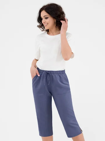 Женские капри с накладными карманами. Элегантная длина с разрезами по бокам. Пояс на резинке и кулисе.