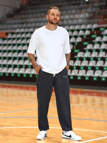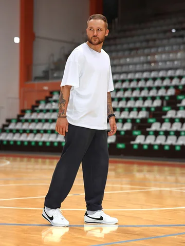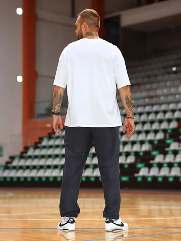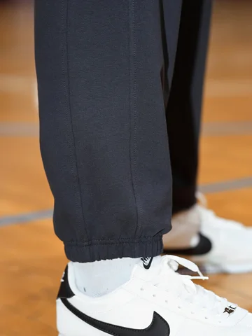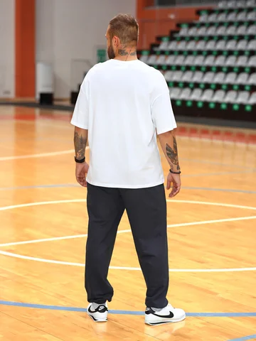 Брюки мужские из трикотажного полотна "футер-двунитка" на притачном поясе с эластичной тесьмой внутри, декоративными вставками в боковых швах и карманами, обработанными в соединительных швах передних половин с декоративными вставками. Нижние срезы брюк обработаны с эластичной тесьмой. По швам втачивания вставок и входам в карманы настрочены отделочные строчки. Через петлю пояса продет шнурок, позволяющий регулировать степень прилегания изделия по талии.