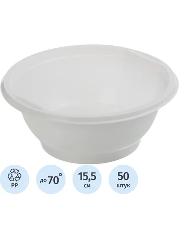 Миска одноразовая пластиковая Комус Эконом 155 мм белая 50 штук в упаковкеОдноразовая пластиковая миска подходит для подачи супов, горячих блюд и салатов. Ее используют в офисных столовых, кафе и заведениях общественного питания.Миска изготовлена из белого полипропилена. Материал безопасен, не выделяет токсичных веществ при нагревании и не способствует развитию бактерий. Изделие выдерживает температуру до +70С и подходит для использования в микроволновой печи. Мытье перед применением не требуется.Диаметр миски - 155 мм, объем - 600 мл. В упаковке 50 штук. Товар произведен под контролем 'Комус'. Мы специально позаботились о Партнерах, которые превыше всего ценят качество и комфорт, и разработали линейку Одноразовой посуды самых востребованных размеров для обеспечения быстрого питания в офисе, образовательных и производственных учреждениях, сферы гостеприимства и общественного питания и многих других. Производство расположено в России, что гарантирует постоянный контроль качества и оптимальные цены.