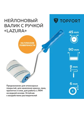 Валик нейлоновый TOPFORT с ручкой, предназначен для эпоксидных покрытий, для нанесения краски, лака, пропитки и клея. Устойчив к воздействию растворителей и рекомендуется для работы с ЛКМ на водной основе на плоских поверхностях. Шубка валика надежно крепится к оснастке с использованием метода термоплавления. Длина ворса 6 мм. Диаметр бюгеля 8 мм. Внешний вид и/или характеристики товара могут быть изменены производителем в соответствии с производственным процессом.