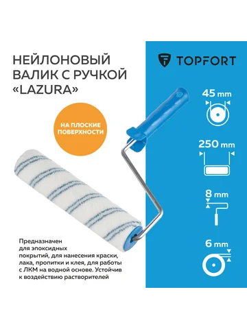 Валик малярный с ручкой TOPFORT Lazura 250 мм нейлон ворс 6 мм Topfort
