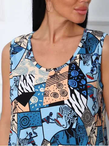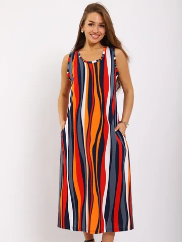 Сарафан женский выполнен из трикотажного полотна кулирка. Сарафан полуприлигающего силуэта, расширенный к низу. Без рукава, прорезные карманы в боковых швах. Горловина, пройма, вход в карман окантованы. Разрезы в боковых швах, длина ниже колена.