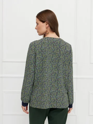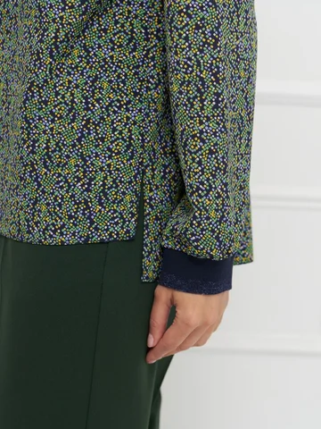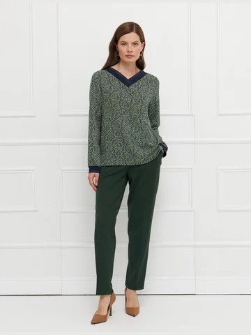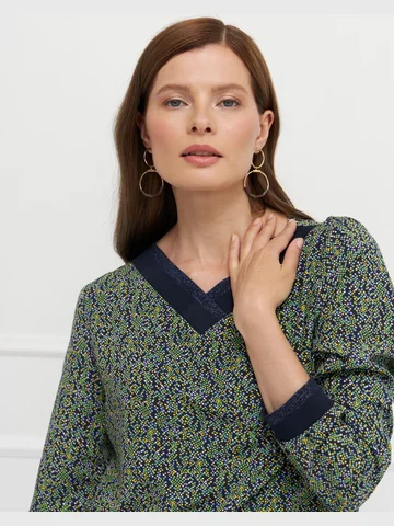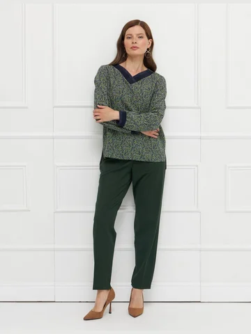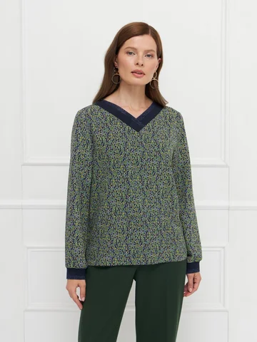 Блузка прямого кроя выполнена из легкой немнущейся ткани с мелким принтом, приятной на ощупь и комфортной в носке. Длинные рукава и разрезы по бокам придают модели легкость и свободу движения. V-образная горловина и манжеты украшены вязаным трикотажным подвязом, добавляющим выразительности и подчеркивающим внимание к деталям. Блузка подходит как для повседневных, так и для более собранных образов, легко сочетаясь с базовыми вещами гардероба. На фото в паре Брюки Б-704 ЗМО(О5).