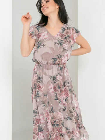 Нежное платье X-образного силуэта из шифона. Горловина переда оформлена V-образным вырезом. Модель отрезная по линии талии, подчеркнута втачным поясом с внутренней резинкой. В проймы вшиты воланы, имитирующие рукава. Низ дополнен широкой притачной оборкой. Платье на подкладе.